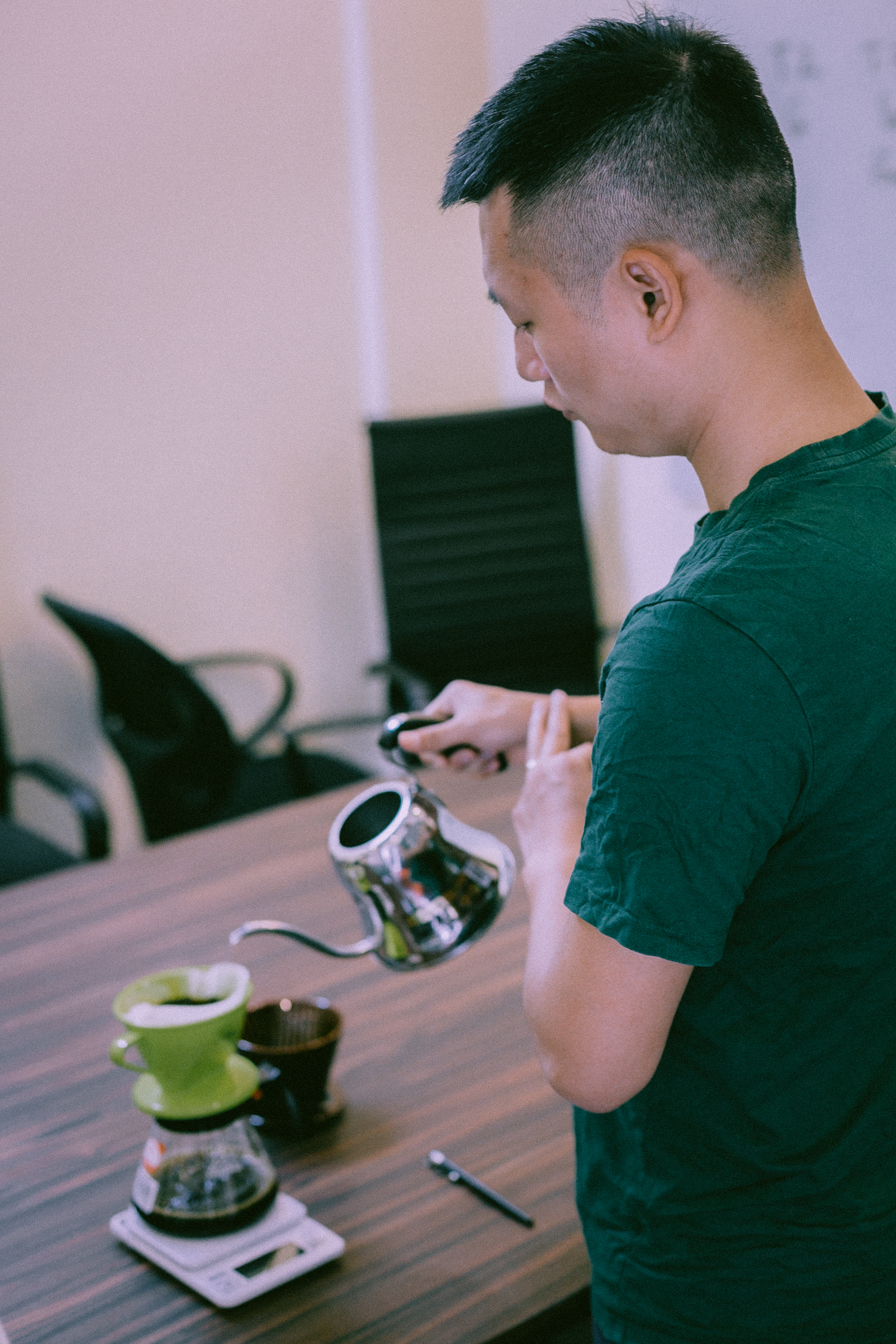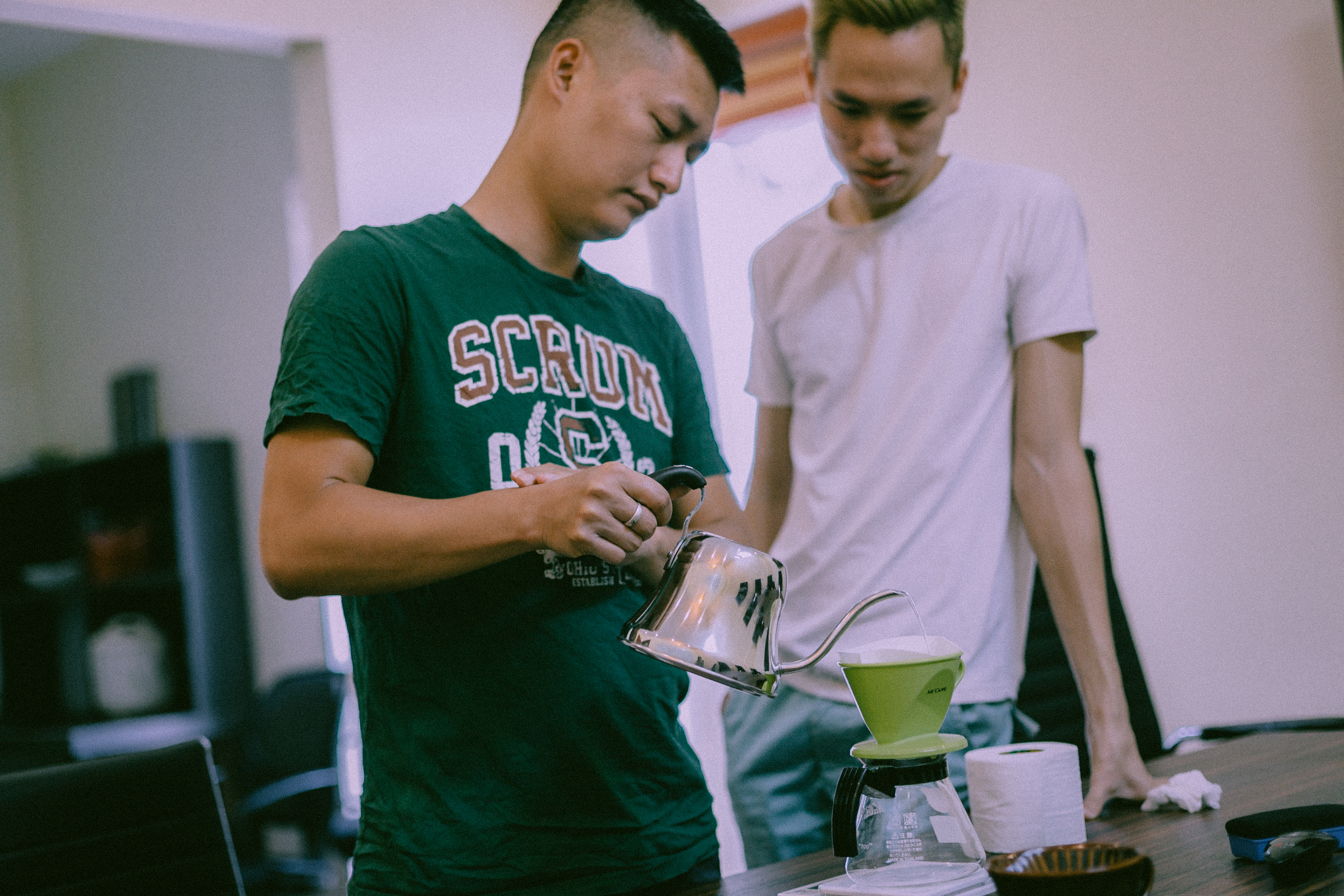 Những ngày đầu, tôi cặm cụi pha chế v60 mà không hề có nhiệt kế, cân tiểu ly hay “kettle” chuẩn. Sau đó, tôi chuyển sang sử dụng French press bởi nó gần gũi với mọi người hơn (Nếu chuyển từ cà phê Việt Nam sang V60 thì ngay lập tức người uống sẽ thấy loãng và nhạt). Sau hơn một năm, khi đã truyền tải những kiến thức về cà phê cho anh em trong CLB, từ nhiệt độ nước, độ rang của cà phê, cách pha chế, timing, giai đoạn “extraction”,v.v.. tất cả chúng tôi nhất trí chuyển qua pour over.