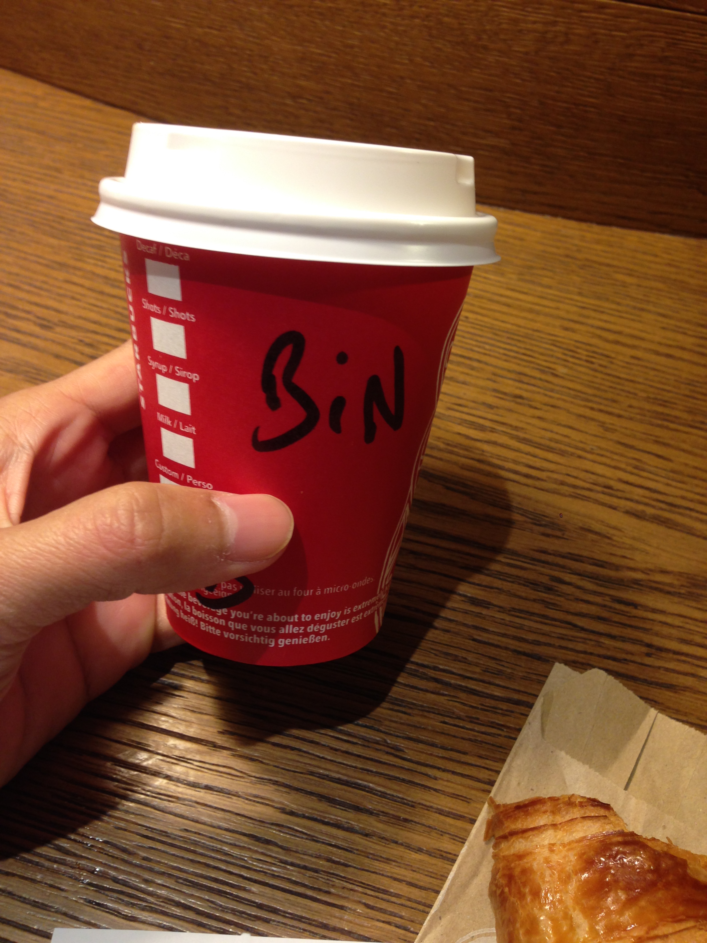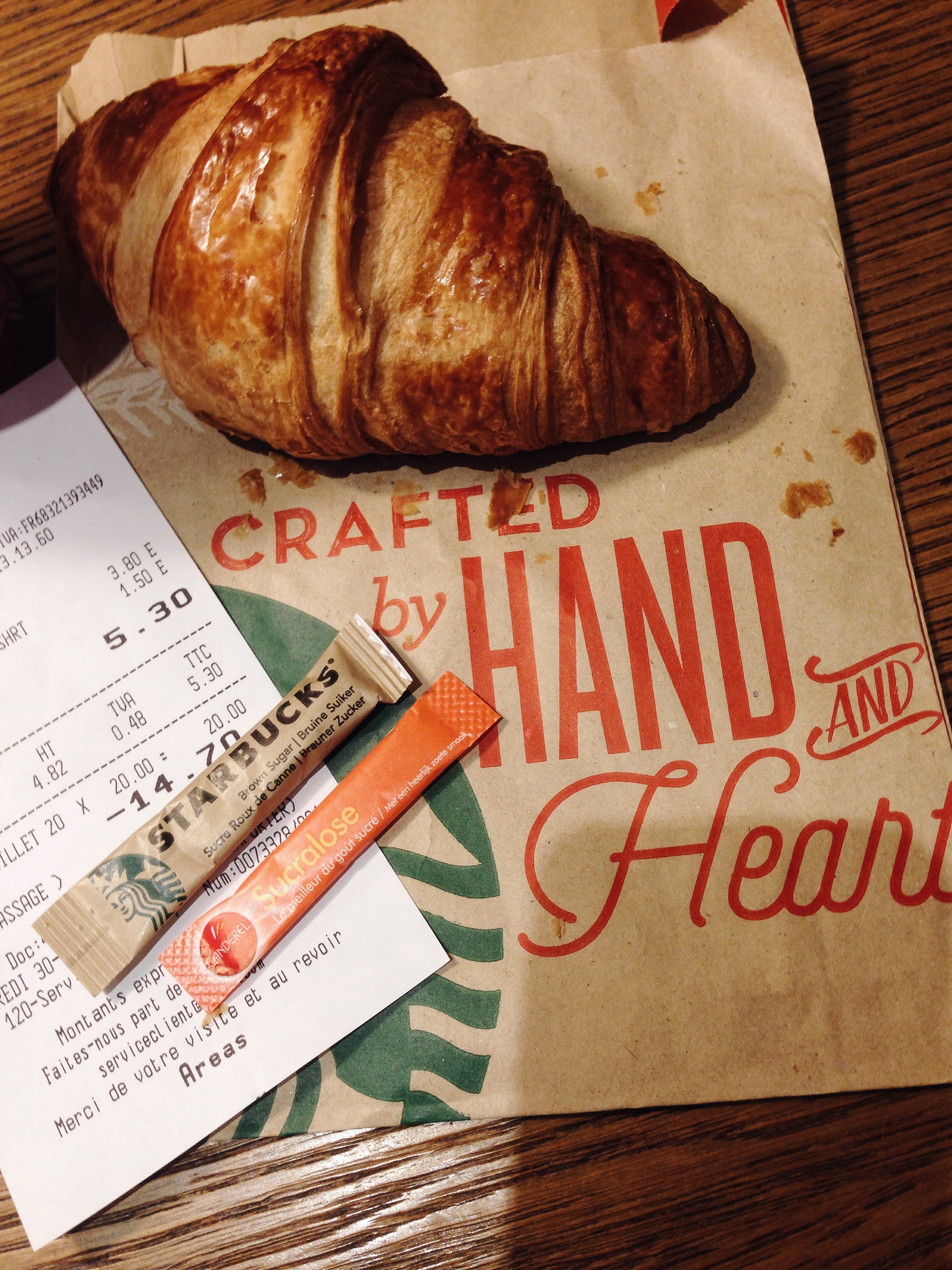 Bon chen lắm mới tới lượt và tôi tranh thủ mua 1 ly cappuccino size nhỏ, 1 chiếc bánh croissant (bánh sừng bò 😀 theo tên gọi VN). Bánh ở đây thì lúc nào cũng ngon, khỏi phải bàn tới. Cà phê thì cũng theo tiêu chuẩn của Starbucks tuy nhiên ly cappuccino của tôi không được “đầy đặn” cho lắm. Nhân viên cũng không thân thiện như nhân viên Starbucks Việt Nam, có lẽ vì Châu Âu họ là như thế, với lại lượng khách quá đông, barista phải xoay sở liên tục không ngừng nghỉ, do đó nếu mệt mỏi thì cũng là điều dễ hiểu.