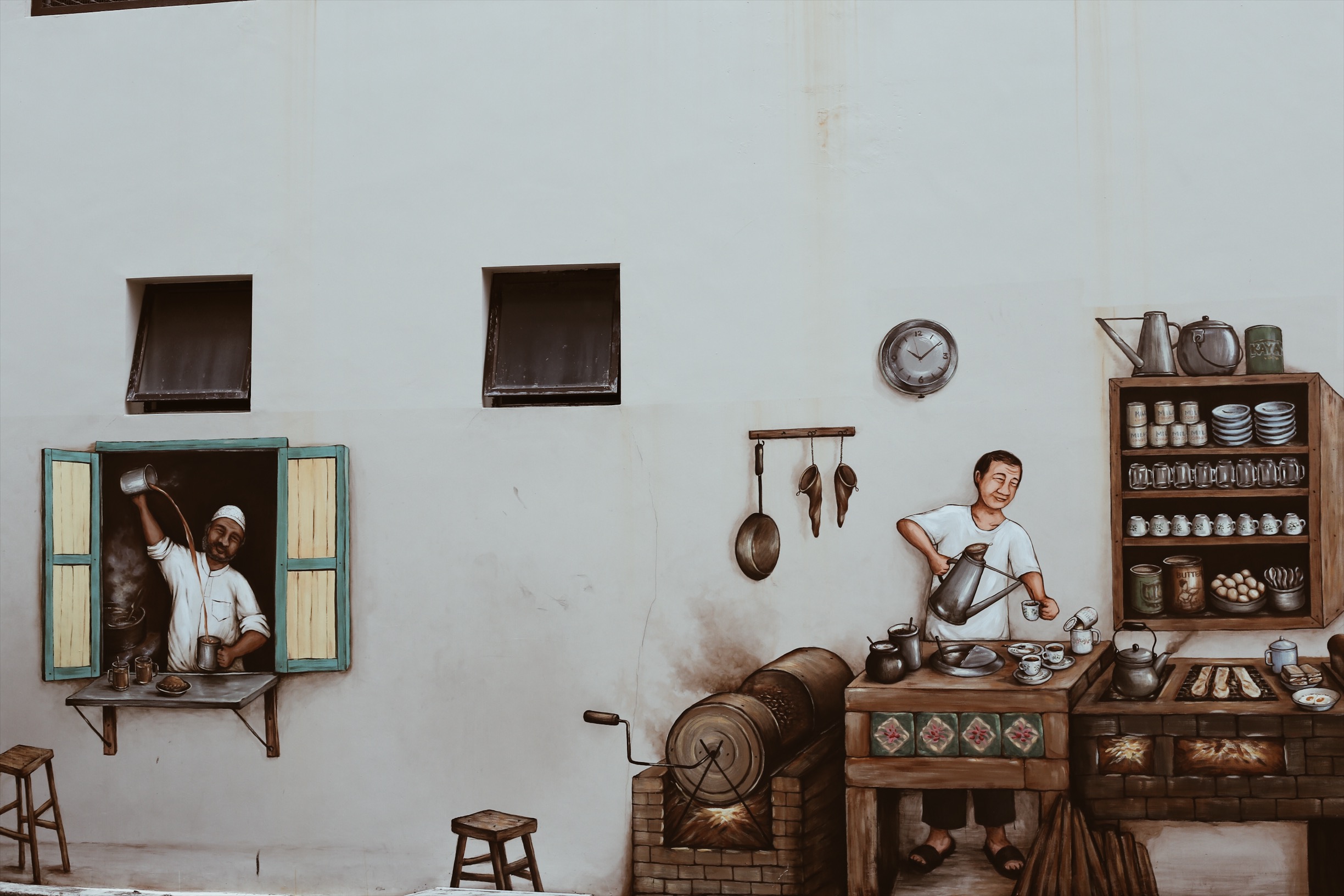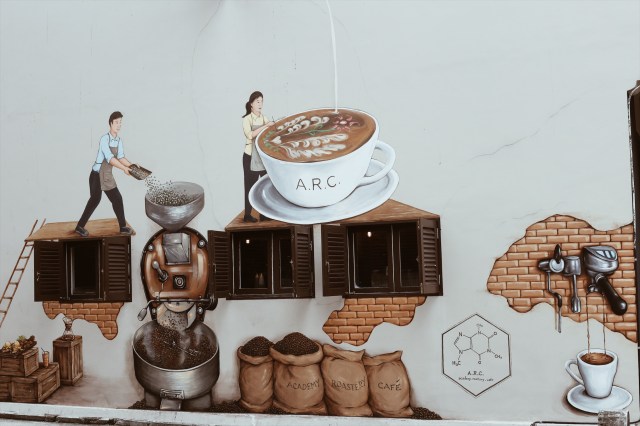 Nằm ở địa chỉ hơi lắt léo nhưng đi một lúc cũng tìm ra, 29 Sultan Gate, Singapore 198477, sau khi đi bộ một đoạn khá dài, chúng tôi rẽ vào khu “shop house” rồi thấy ARC nằm ở góc đường bằng cách nhìn vào những hình vẽ cà phê trên tường của quán. Ghé thăm quán vào ngày cuối năm nên hầu như không có khách, có lẽ dân Singapore cũng rủ nhau đi du lịch cả rồi, lác đác có khách quen đi hơi qua mua cà phê mang đi, nhân viên cũng chỉ có 2 bạn, một người đang làm bánh, một người pha chế cà phê phục vụ khách.