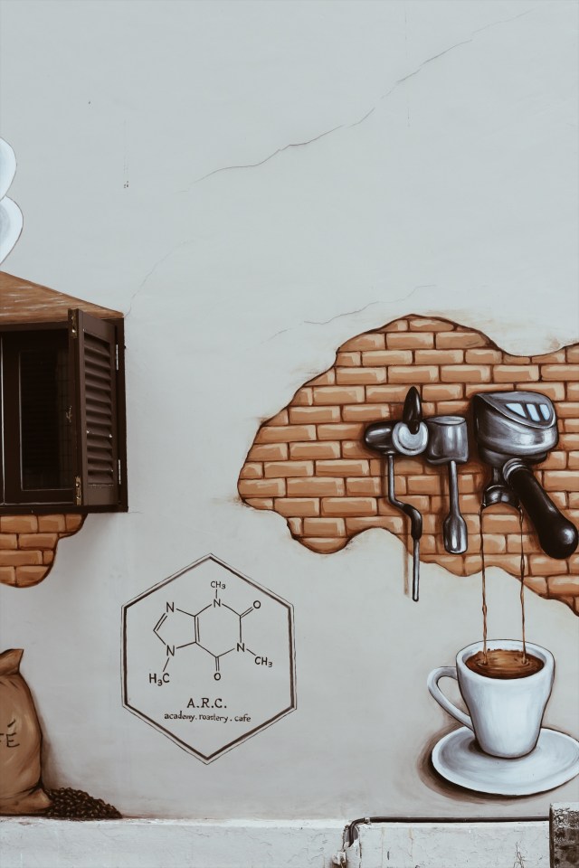 Thay vì dán những poster trong quán, ARC chọn cách “educate” khách hàng của mình bằng cách vẽ qui trình rang xay, pha chế cà phê lên các bức tường xung quanh. Logo của quán cũng là cấu trúc hoá học của cà phê khiến những người lần đầu đi ngang qua thấy vô cùng ấn tượng.