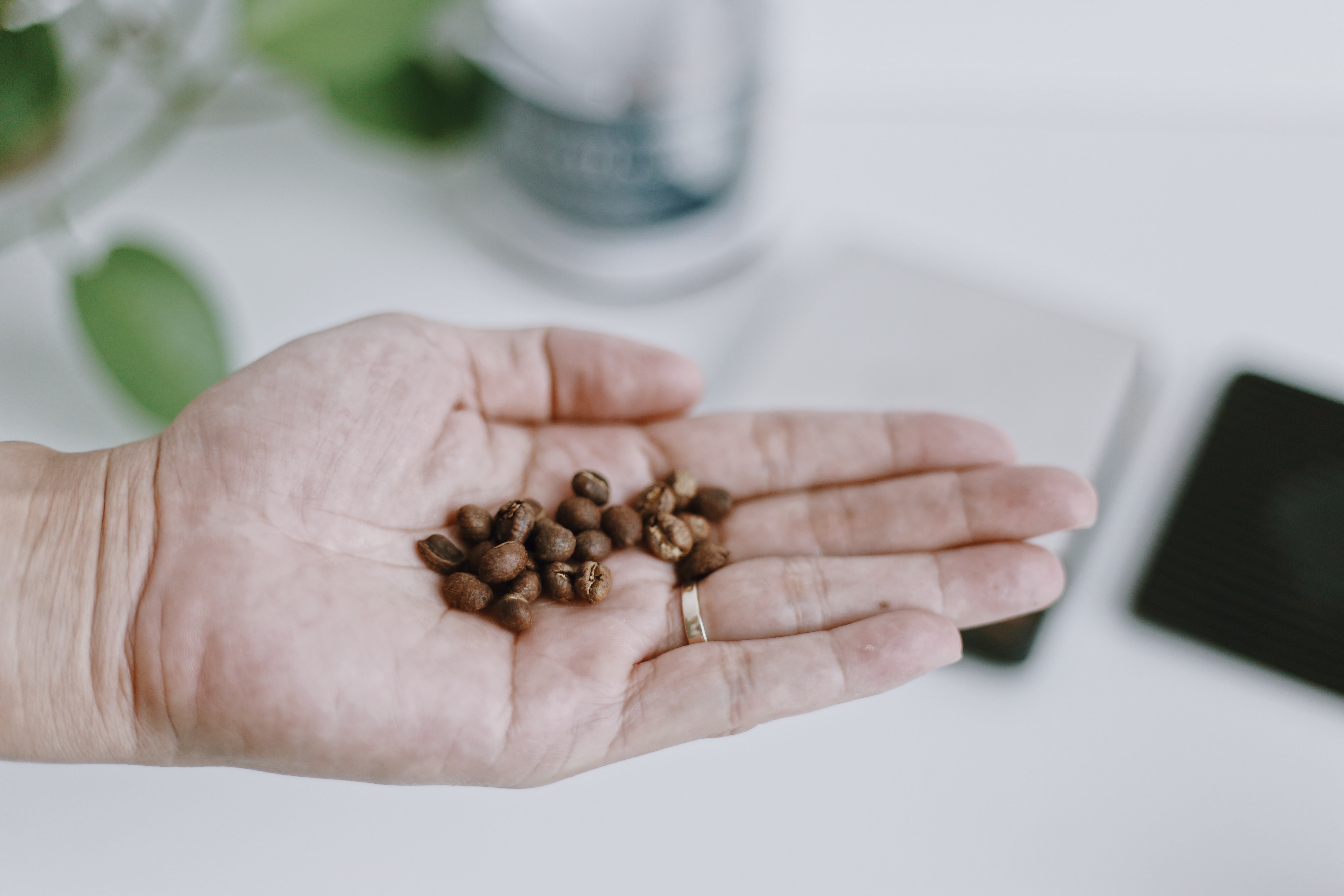 Trên tay những hạt cà phê peaberry tròn vo xinh xắn. Ảnh: Justiamo